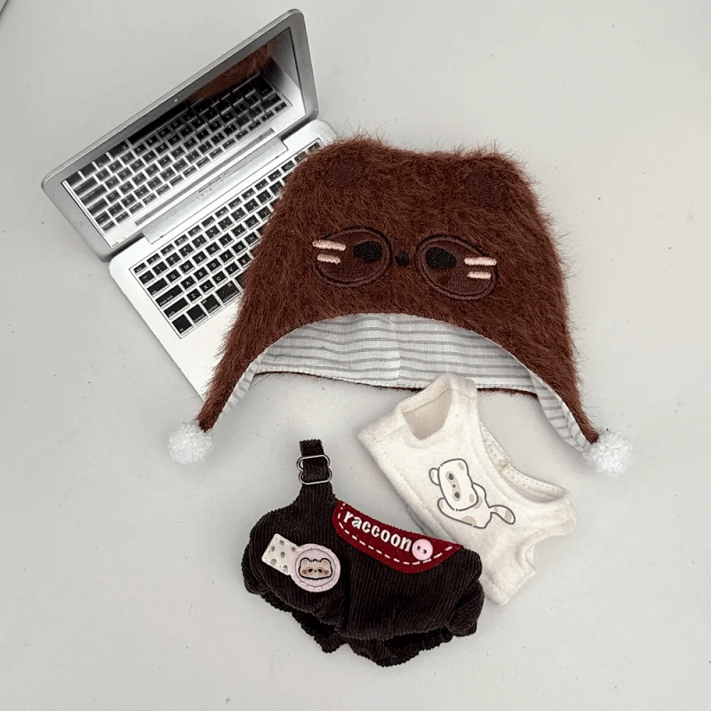 ふわふわのアライグマ風ニット帽と、ゆったりシルエットのコーデュロイサロペットが可愛いぬい服セット。
